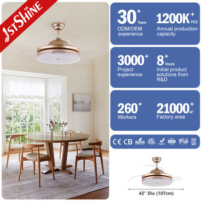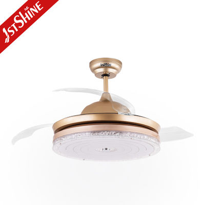 Ventilador de teto retrátil moderno dourado com 3 lâminas transparentes e luz LED