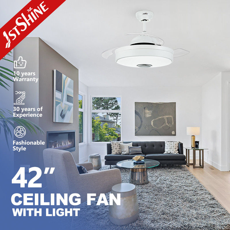 O ventilador de teto retrátil inteligente é equipado com HIFI. A luz LED regulável seguirá a música para iluminar seu quarto. Além disso, a tela especial na parte inferior suaviza o brilho da luz e garante uma iluminação mais suave. Ventilador e lustre combinados em um com controle remoto, lâmina de ventilador telescópica automática, contas de lâmpada LED. Deixe o espaço do seu quarto dançar com você.